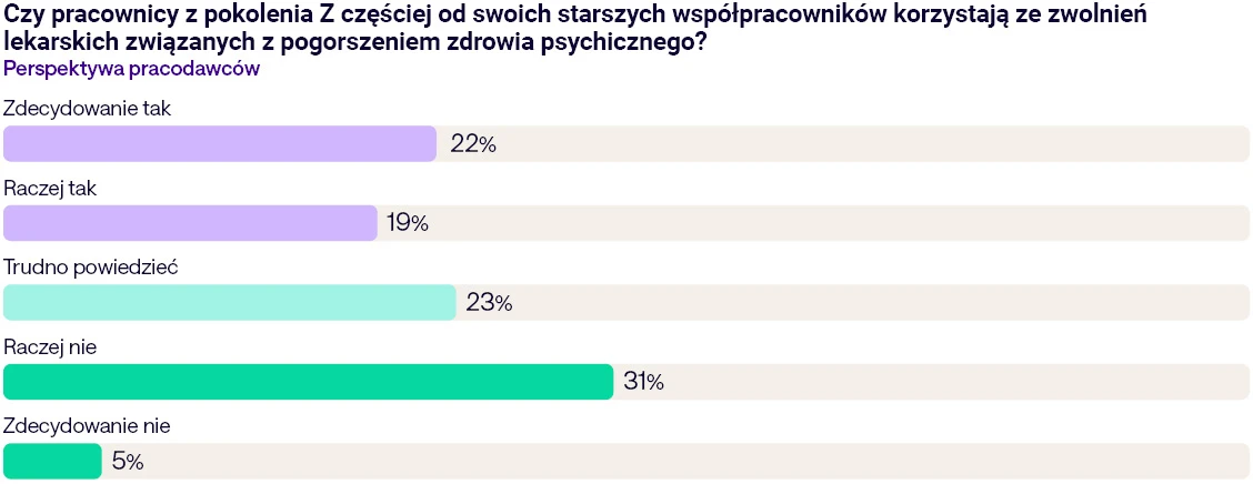 Biorąc to pod uwagę, mniej zaskakuje fakt, iż według 41 proc. ankietowanych firm pracownicy z pokolenia Z częściej od swoich starszych współpracowników korzystają ze zwolnień lekarskich związanych z pogorszeniem zdrowia psychicznego.