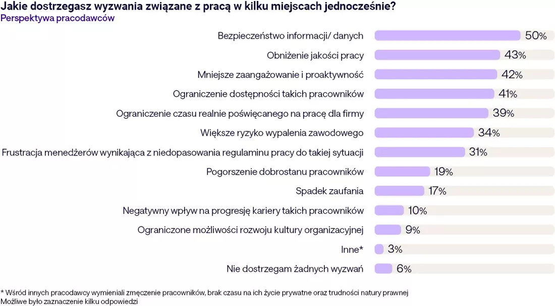 Liczne korzyści, jakie zdaniem respondentów płyną z wieloetatowości, nie wykluczają jednak wielu wyzwań. Co ciekawe jednak, Zetki patrzą na potencjalne wady zupełnie inaczej niż pracodawcy. Z perspektywy młodych wieloetatowość może być źródłem problemów z dobrostanem psychicznym: przepracowania (75 proc.), stresu (64 proc.) i przeciążenia komunikacyjnego wynikającego z konieczności bycia „na bieżąco” w więcej niż jednym miejscu pracy (60 proc.). To dla nich też potencjalne ryzyko wypalenia zawodowego (47 proc.).
