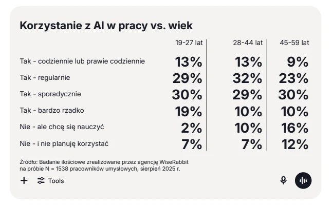Z drugiej strony interesującym jest, że 9 proc. przedstawicieli pokolenia X używa AI codziennie lub prawie codziennie – to nieznacznie mniej niż wśród młodszych pracowników (13 proc.), co pokazuje, że jest wąska grupa X-ów, która szczególnie aktywnie adaptuje nowe technologie.
