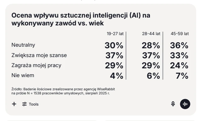 Raport „Jak pracować, by nie żałować? W dobie rewolucji AI” portali pracy rocketjobs.pl i justjoin.it, ujawnia złożony obraz adaptacji do AI w pracy wśród pracowników 45+. Z jednej strony 2/3 z nich deklaruje satysfakcję z pracy ze wsparciem sztucznej inteligencji, z drugiej tylko nieco ponad połowa (54 proc.) ma optymistyczny stosunek do swojej przyszłości zawodowej. Pokolenie X jest też najmniej świadome zmian jakie niesie ze sobą rewolucja AI i tylko 30 proc. deklaruje, że ma w pracy dostęp do zaawansowanych narzędzi (wobec 46-49% młodszych pracowników).