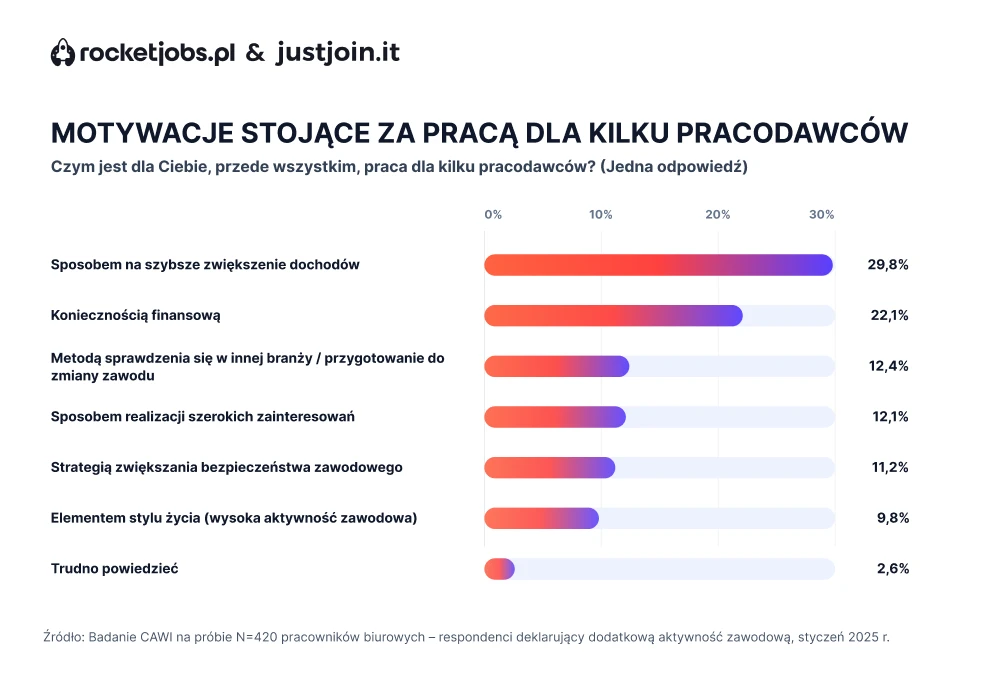 Motywacje stojące za podejmowaniem dodatkowej pracy są zróżnicowane, ale dominuje aspekt finansowy. Dla 29,8 proc. badanych polyworking jest sposobem na szybsze zwiększenie dochodów, a dla 22,1 proc. stanowi wręcz konieczność finansową.