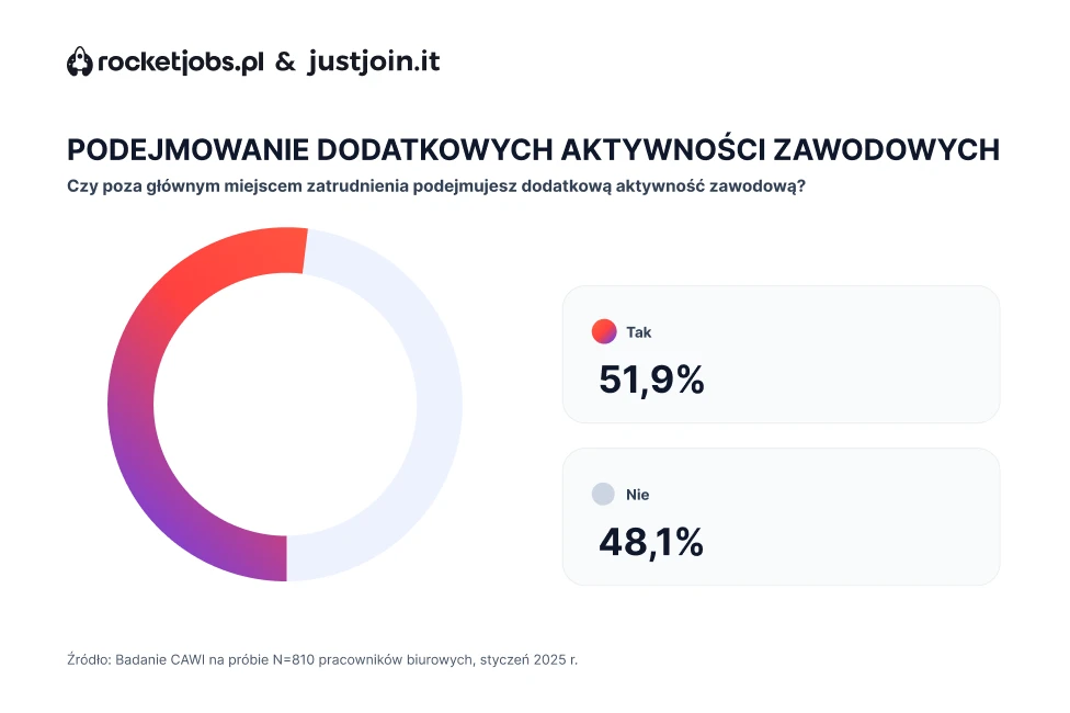 Dla pracodawców to ryzyko spadku efektywności, a nawet konfliktu interesów, ale również sygnał rynkowy, że wynagrodzenia, model pracy i ścieżki rozwoju nie zawsze odpowiadają potrzebom ludzi – komentuje Paulina Świątkiewicz, HR Business Partner w portalach pracy rocketjobs.pl i justjoin.it. – Najlepiej sprawdzają się jasne zasady dotyczące dodatkowych aktywności i otwarta komunikacja, które pozwalają ograniczyć zagrożenia i wykorzystać potencjał rozwojowy pracowników - dodaje.