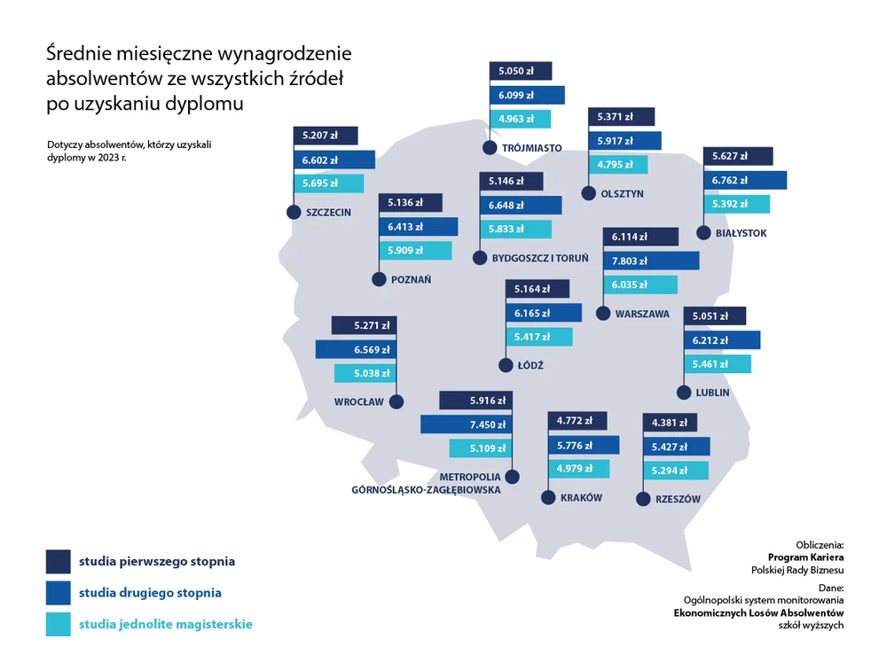 – W pewnym uproszczeniu można powiedzieć, że Kraków to miasto kultury, a zarobki w tym sektorze są relatywnie niskie. Z kolei Bydgoszcz i Toruń to przemysł oraz sektor bezpieczeństwa, które były w niezłej kondycji w okresie post-Covidowym i po agresji Rosji na Ukrainę. Warszawa natomiast to usługi specjalistyczne i firmy międzynarodowe. A pierwsza poważna praca określa przyszłe szanse zawodowe – tłumaczy wiceprezes Polskiej Rady Biznesu.