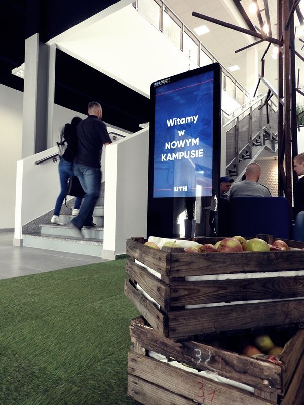 - Cały kampus utrzymany jest w industrialnej stylistyce, z dominującymi barwami uczelni.
